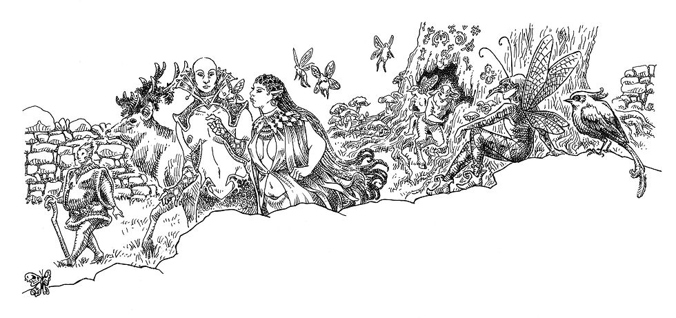 Original cross-hatch illustrations. Each piece is an overlay of blue sketch and fine black line.